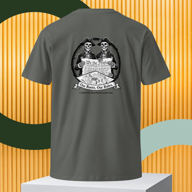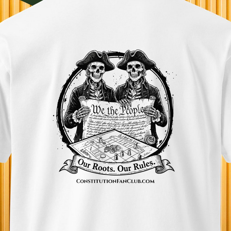 “Founders’ Game” reimagines early American resolve through a stark, symbolic lens: two skeletal founders gripping the Constitution above a board labeled Liberty, reminding us that the rules of our civic life are rooted in enduring principles, not shifting convenience. The artwork carries a solemn strength—steady, resolute, and unbroken.