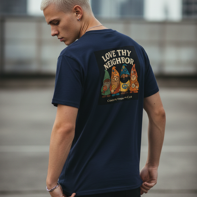 A joyful reminder that democracy starts with empathy, this design features friendly, flower-holding figures united by a simple truth: loving your neighbor is an act of civic courage and everyday resistance.